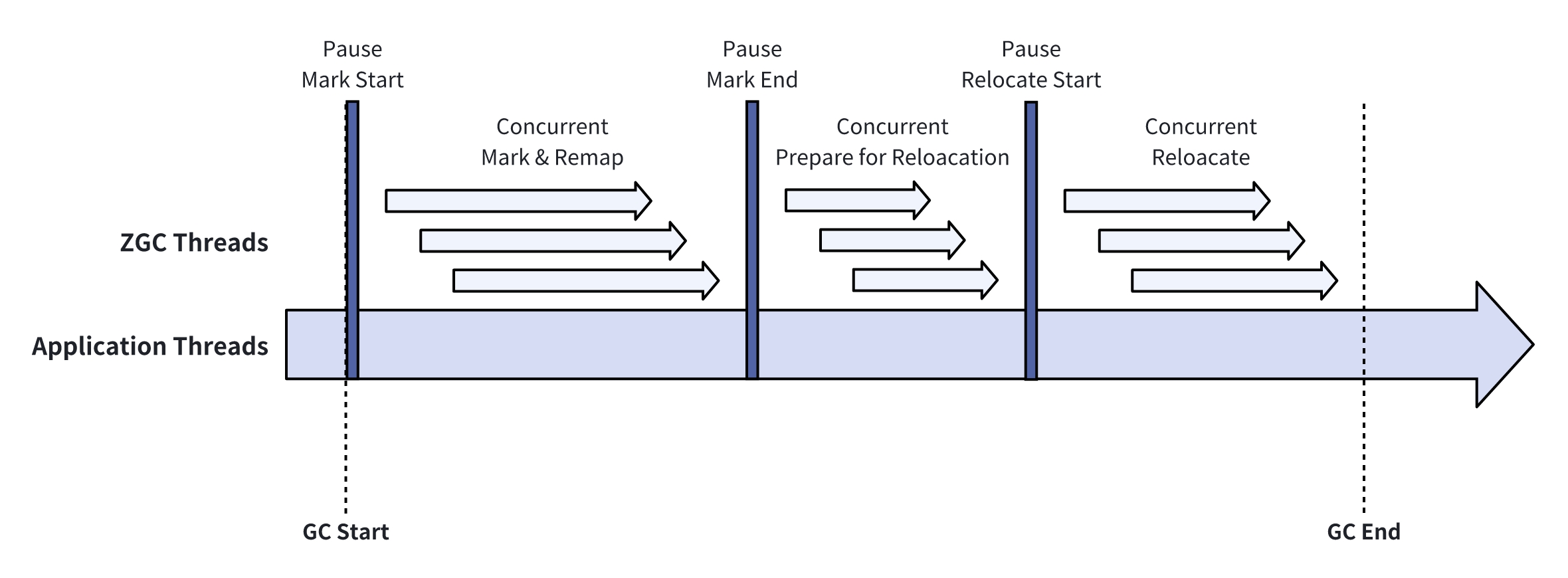 该阶段会并发地迁移对象,压缩堆中的区域,以释放空间。迁移后的对象的新地址会记录到转发表(Forwarding Table)中,用于后续重映射时获取对象的新的地址;该转发表是一个哈希表,使用堆外内存,每个区域分别有一个转发表。可以看到,在一个 GC 周期中,STW 的阶段和并发阶段交替执行,并且绝大多数操作均在并发阶段执行。