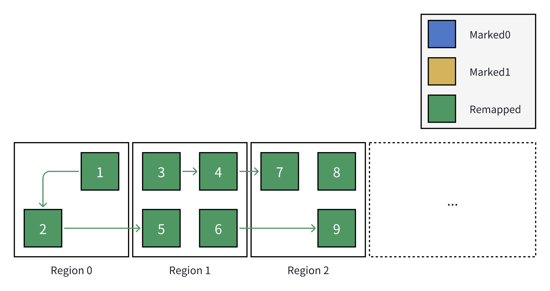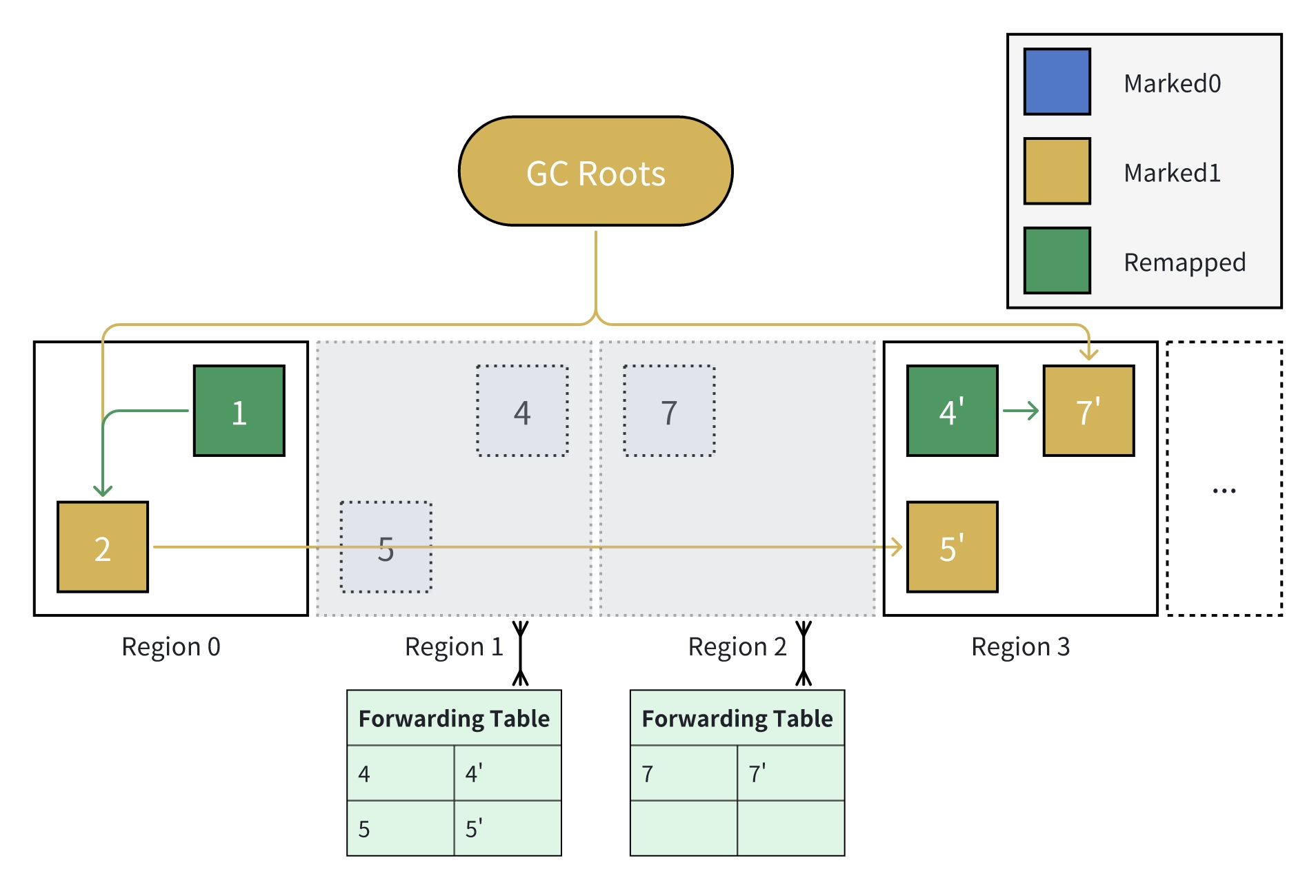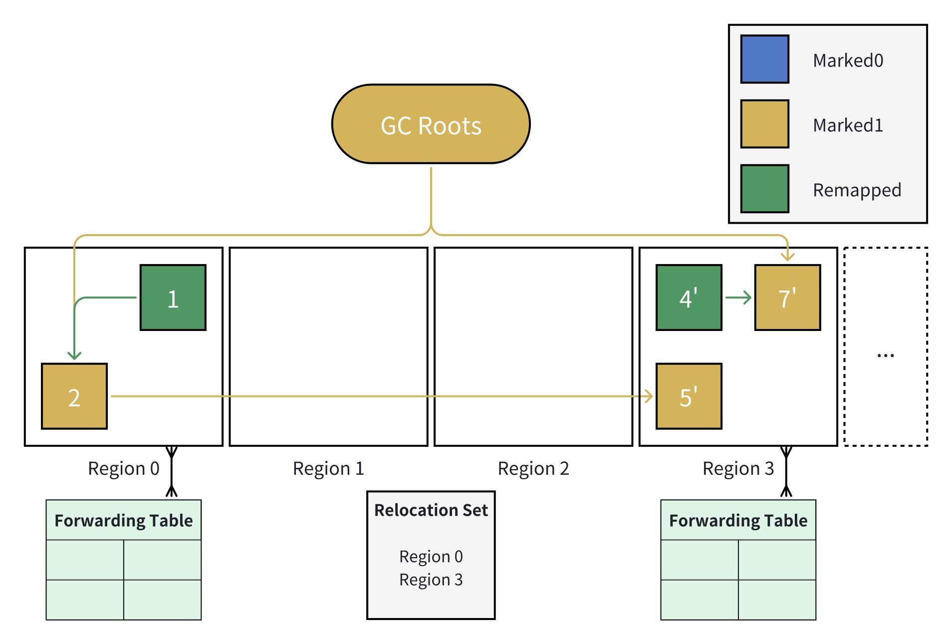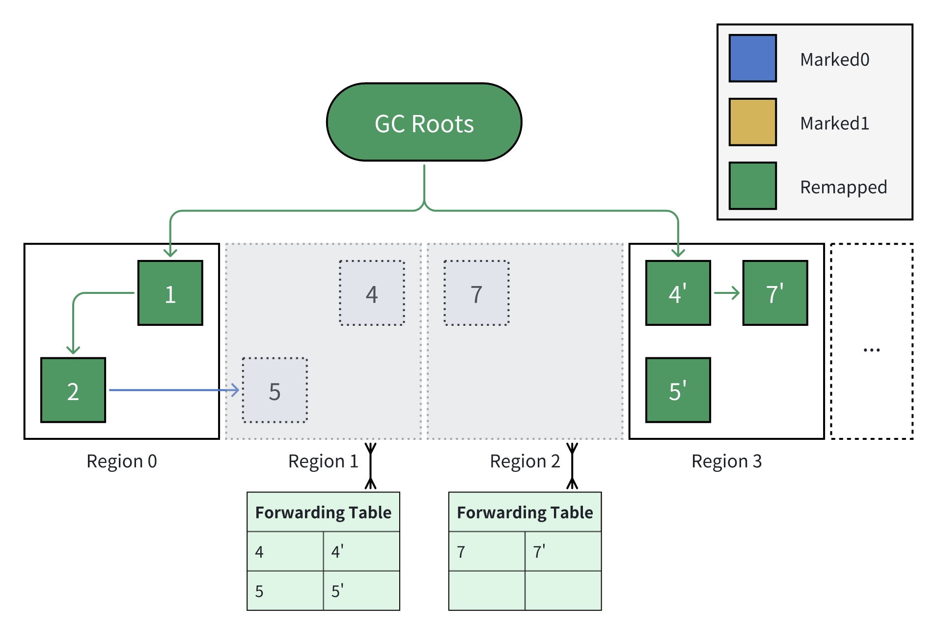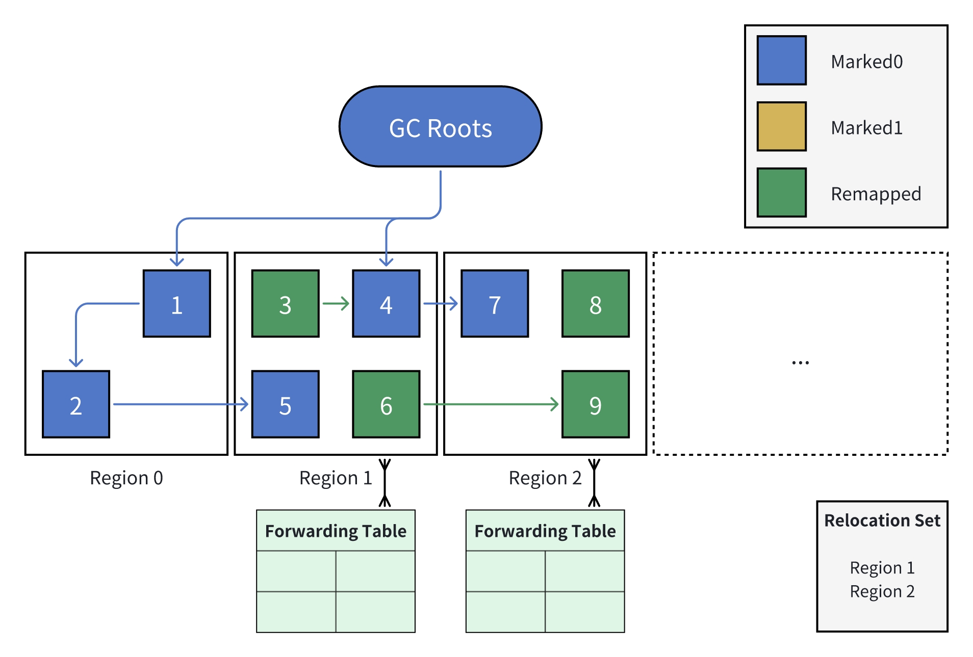 GC Roots(例如,线程栈中引用的对象,静态变量等)为每次标记的起点,所有被 GC Roots 引用的对象都应被认为是存活的;同样的,如果未被标记(颜色仍为 Remapped),则认为可被回收。