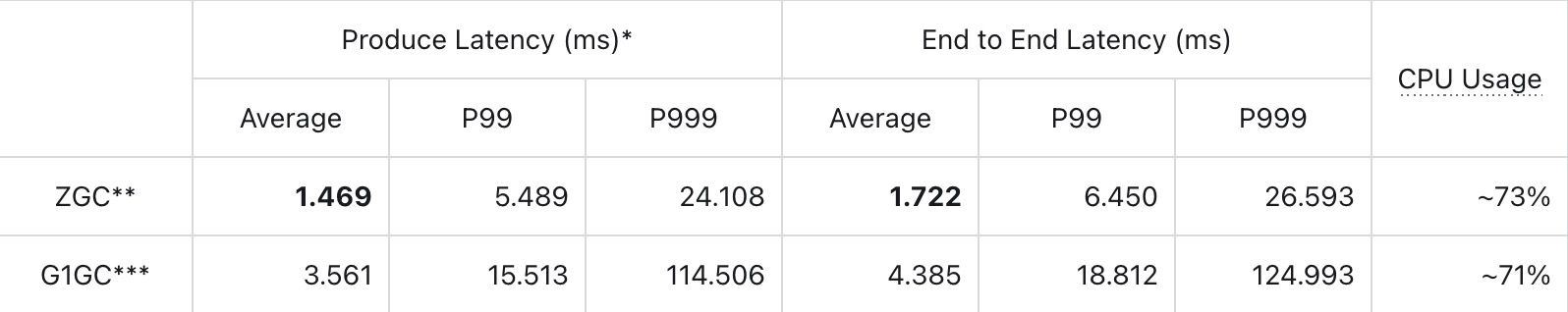 AutoMQ 经过大量的压测与调优,得益于 ZGC 并发 GC 的优势,实现了极低的延迟。下表对比了 AutoMQ 在 ZGC 和 G1GC 下的表现: