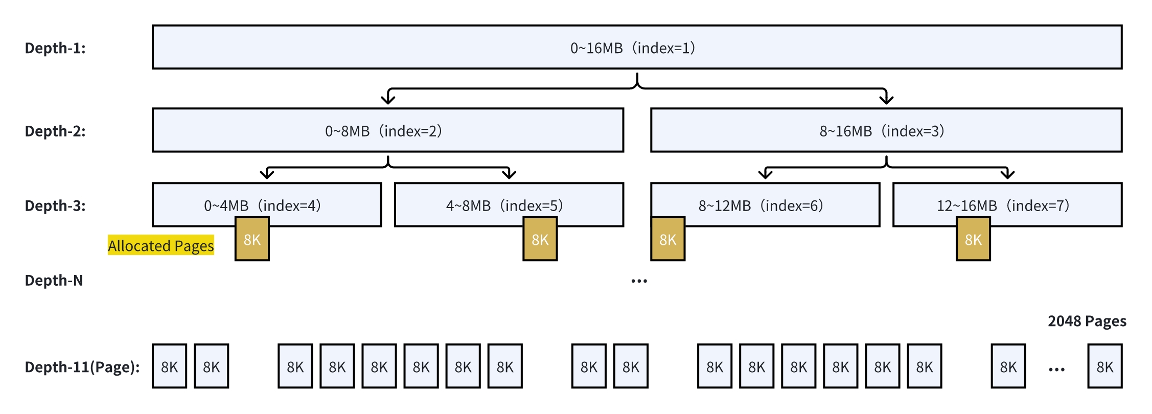 2049KB 以 2 为底向上规格化后变为 4MB,于是查找目标为 Depth-3 的空闲节点;