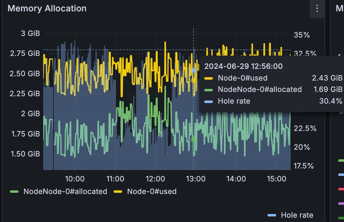 加上分类内存统计后,发现各种类型的内存使用量都在预期范围内。不过异常的是,AutoMQ 申请的内存量和 Netty 实际申请的内存量有较大的差距,并且随着运行两者之间的差值越来越大,甚至有时候 Netty 实际升级的内存是 AutoMQ 申请的内存量的两倍,这个差值为内存分配的内存碎片。