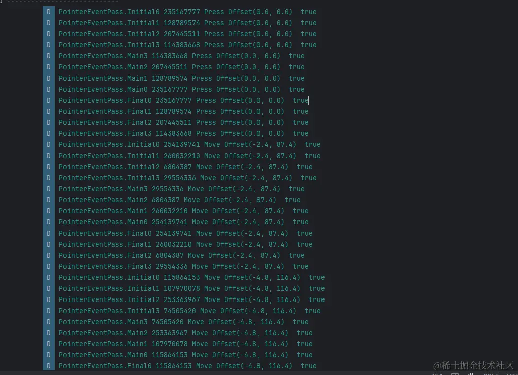 可以发现,Compose 事件传递是有三种类型的 Initial, Main, Final 。 Initial 和Final 是从前往后的,类似VIewGroup的dispatchTouchEvent,onInterceptTouchEvent,都是父View 先处理的。Main 类似onTouchEvent 最后面的优先处理。