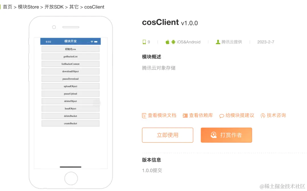 在APICloud的模块Store搜索cosClient,即可看到该模块。