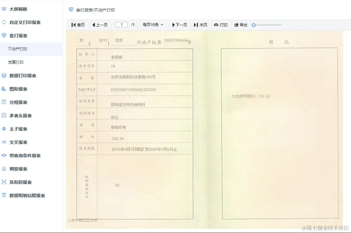 - 支持打印设计(支持套打、背景打印等)可设置打印边距、方向、页眉页脚等参数 一键快速打印 同时可实现套打,不动产证等精准、无缝打印