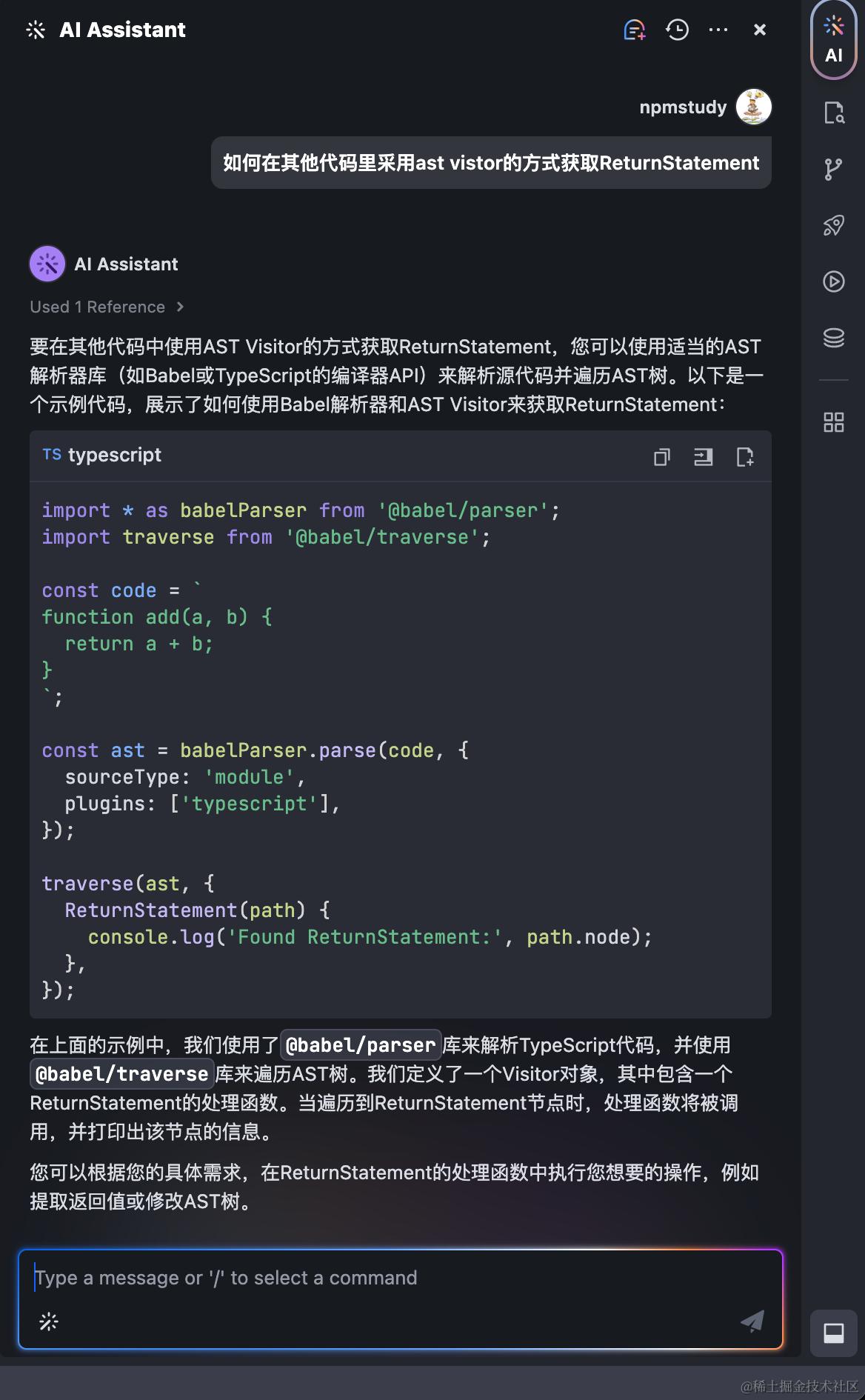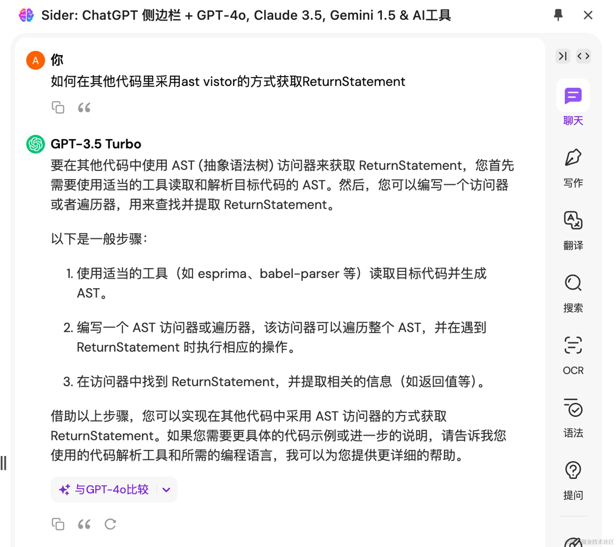 我日常用问答式的应用还是比较多的,这里面我选了一个我最近常用的 AST Vistor 的写法,分别测试一下。