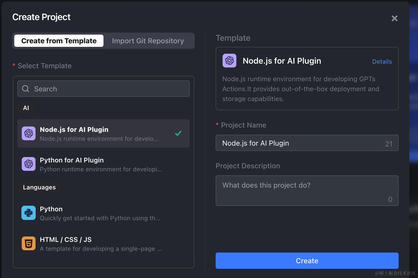 首先,在官网场景一个 Node.js 项目。注意这里选择的是 Node.js for AI Plugin,这是官方推荐的模版。