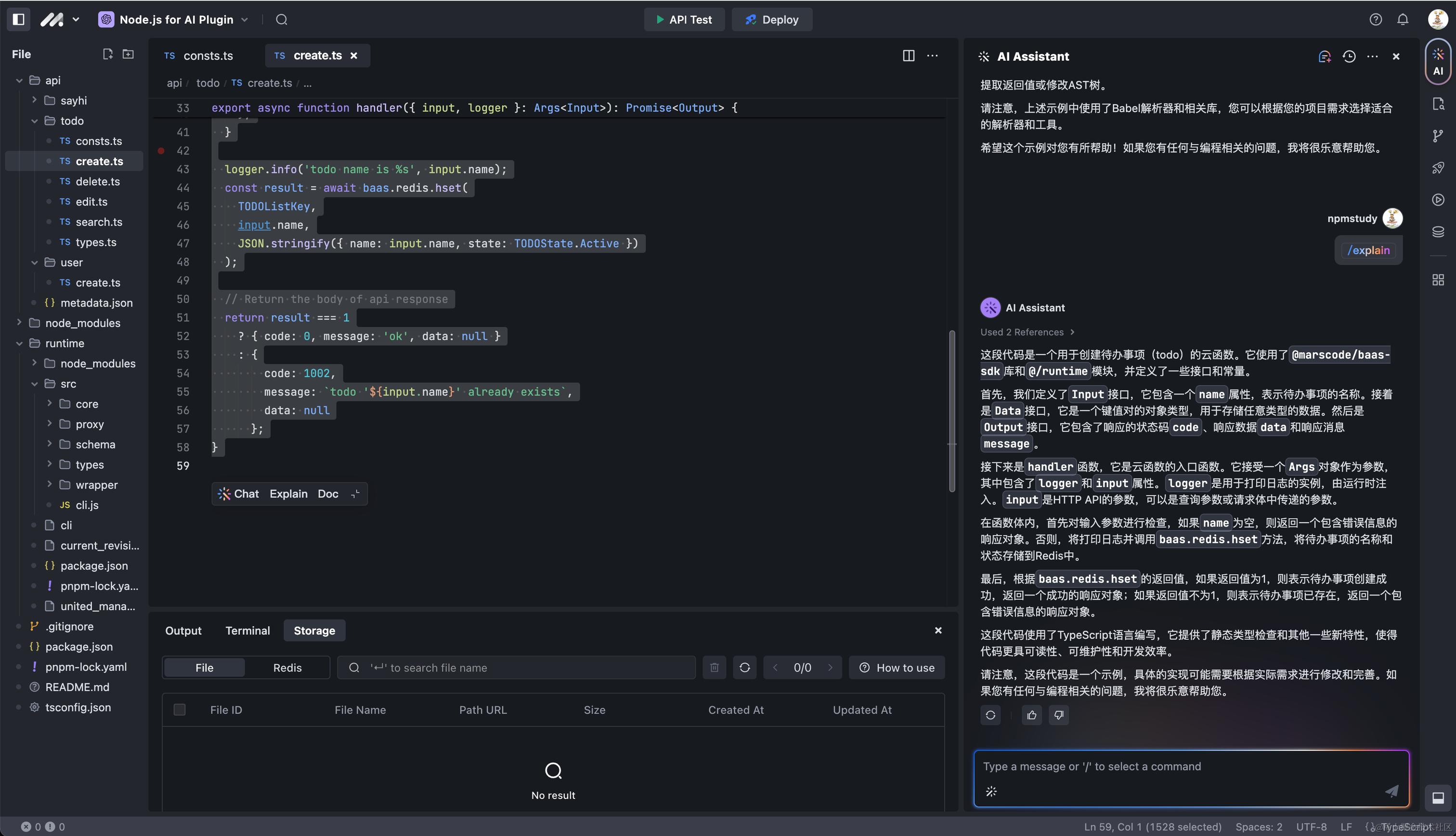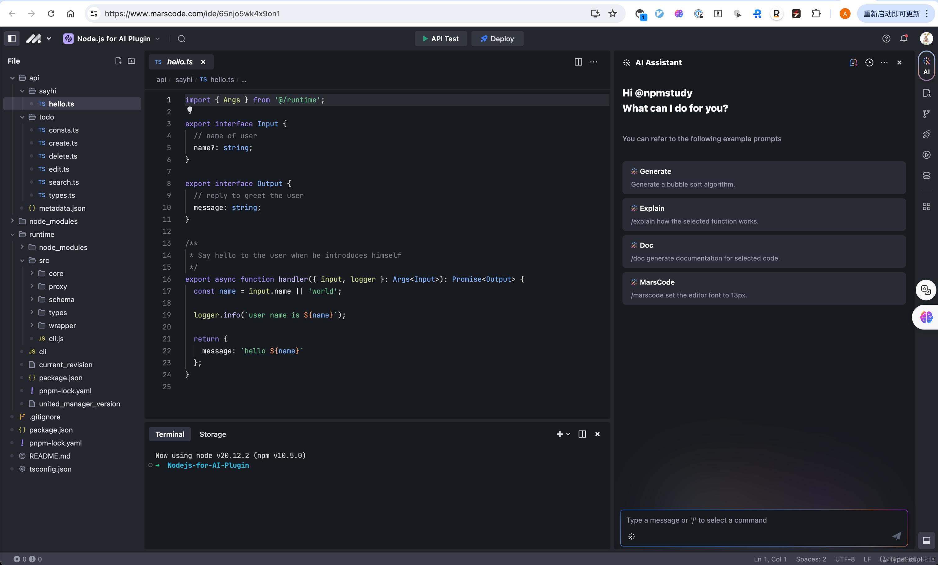 我个人对 Node.js 比较熟悉,就以这个角度来做分析是比较容易的。这里我选了 Node.js for AI Plugin 这个模版,它是专门服务 Chatgpt 插件场景的,MarsCode 还有非常多的其他模版,支持社区绝大部分框架(比如 React、Vue、Python、Go、Rust 等),也支持从 Git Repo 导入,理论上支持所有语言和框架。