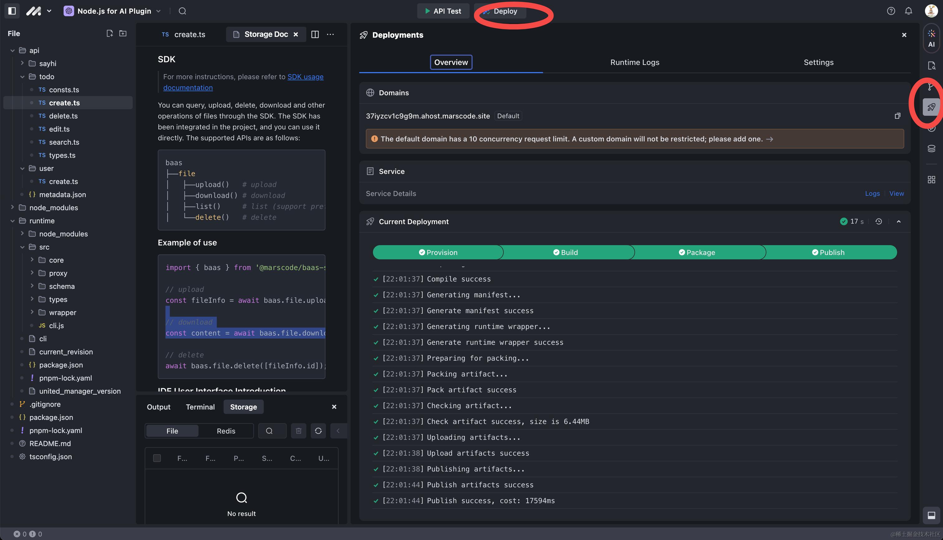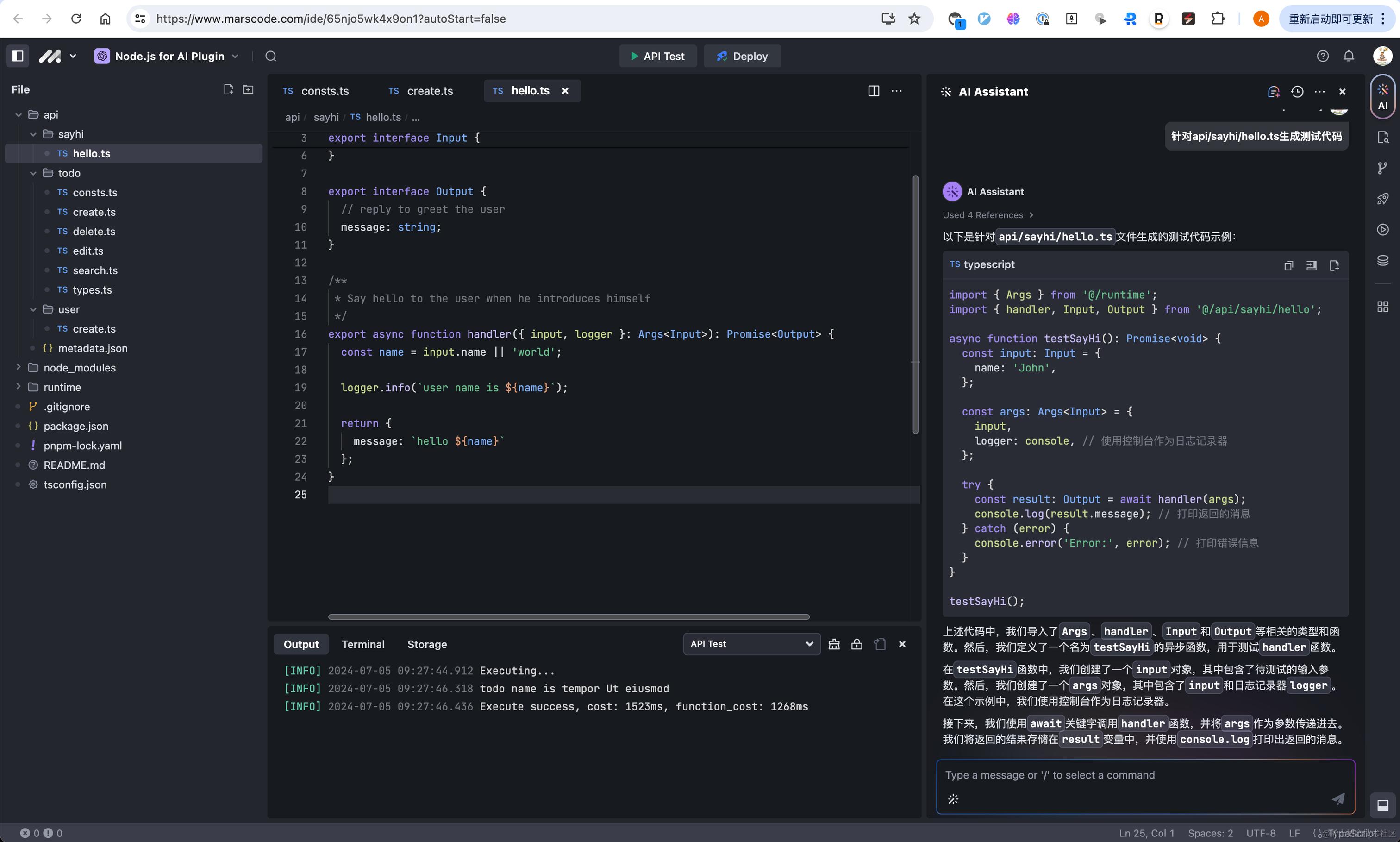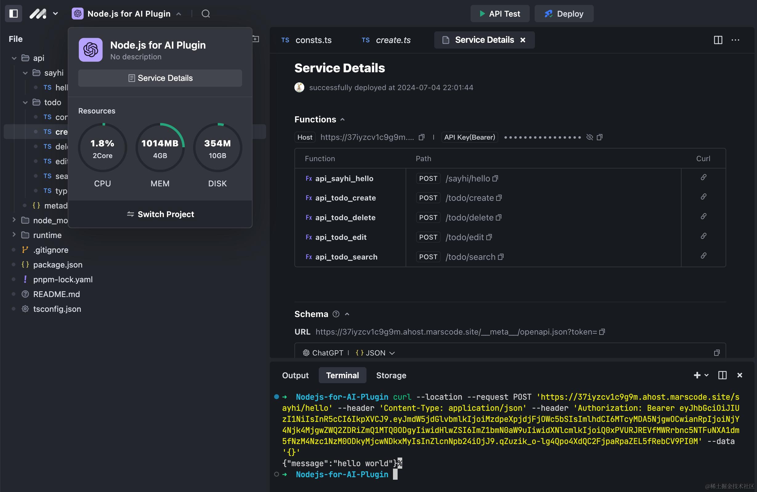 在 MarsCode WebIDE 里是有终端的,但你不需要自己启动服务,它会自动帮你运行。API Test 前面大家都看到了,下面我们再看看它的一键部署过程。