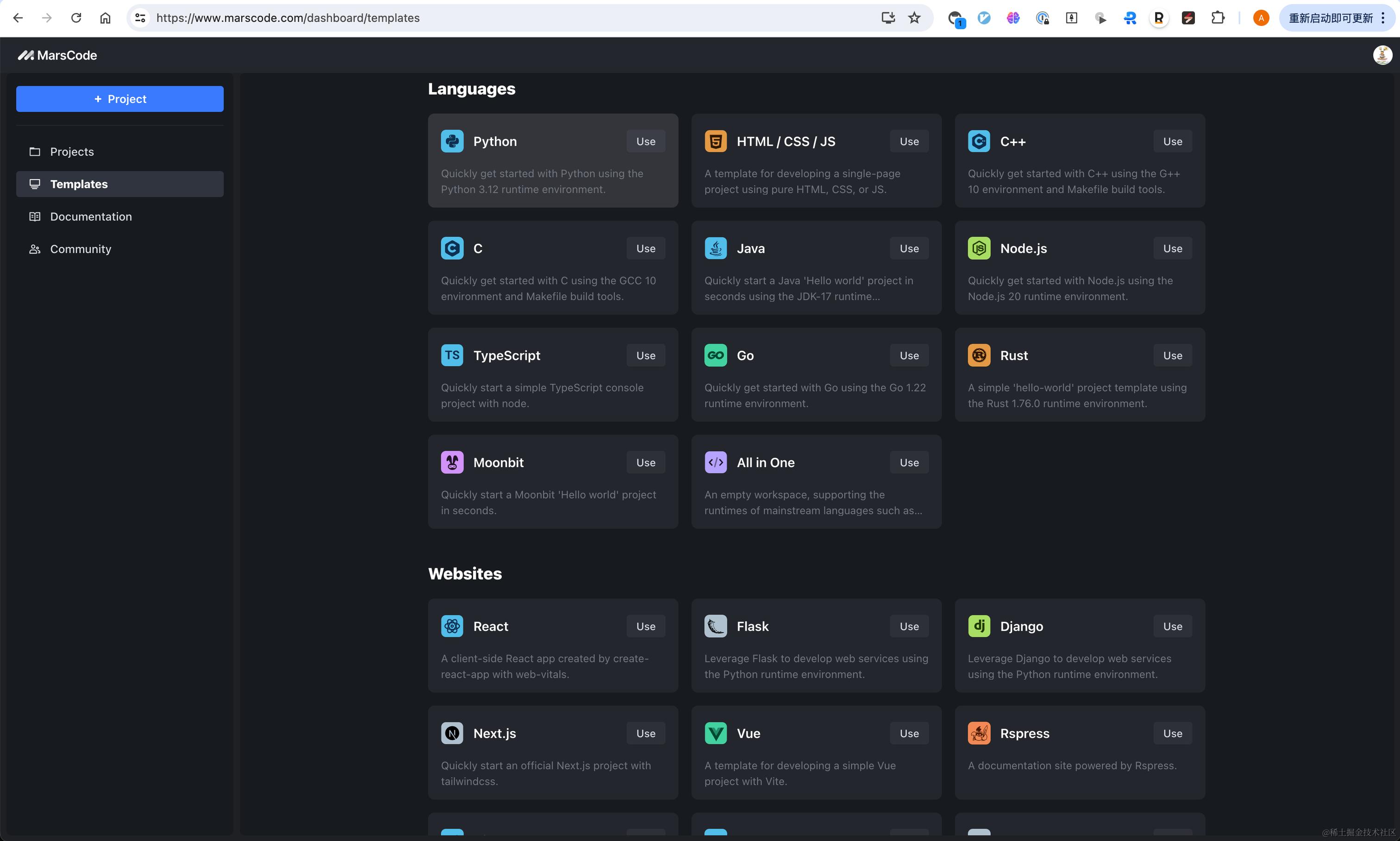 MarsCode 同时支持从模版创建项目和从 Git Repo 导入,也就是说,你可以使用任意技术栈任意框架,它是一个通用的 WebIDE + 运行环境。我个人最喜欢它的 Node.js 云函数项目模版,简单实用,结合 AI 代码提示,写起来非常高效。
