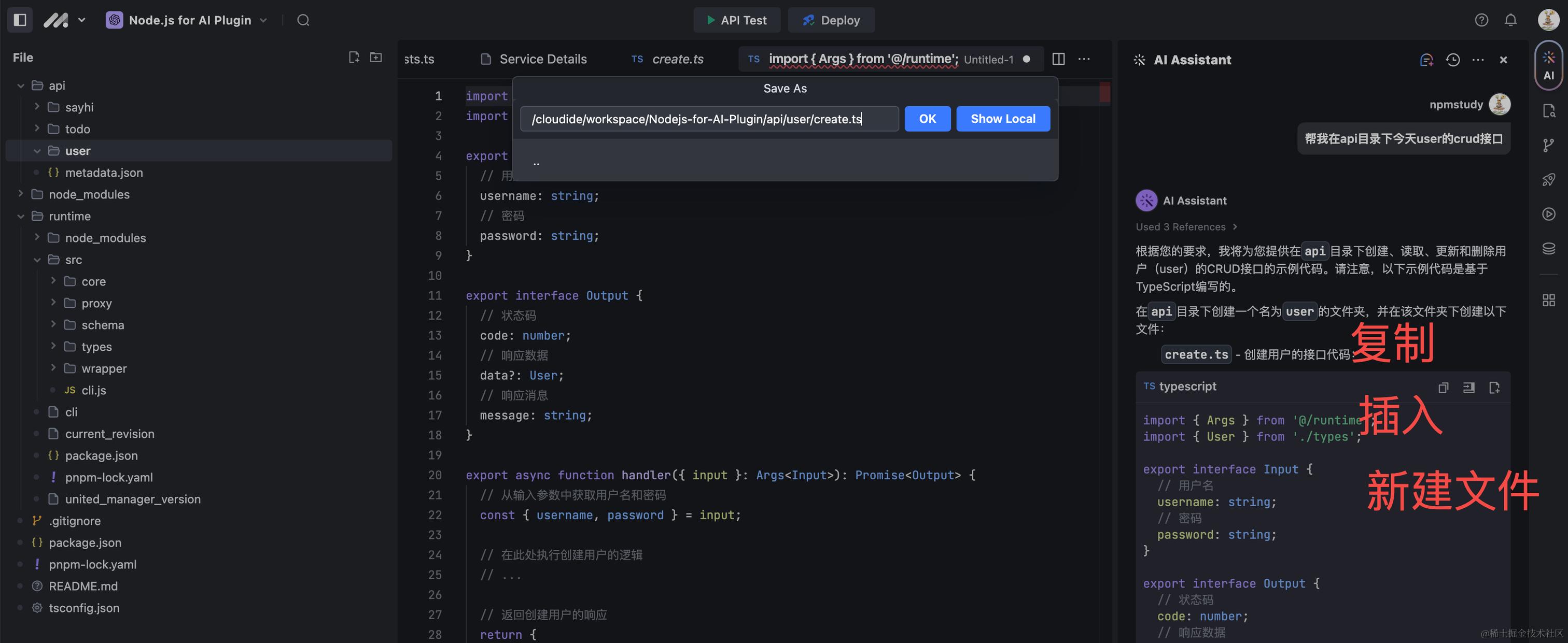 所以,我想按照这个方式嚯嚯一下 MarsCode。于是向它提问:帮我在api目录下新建user的crud接口。