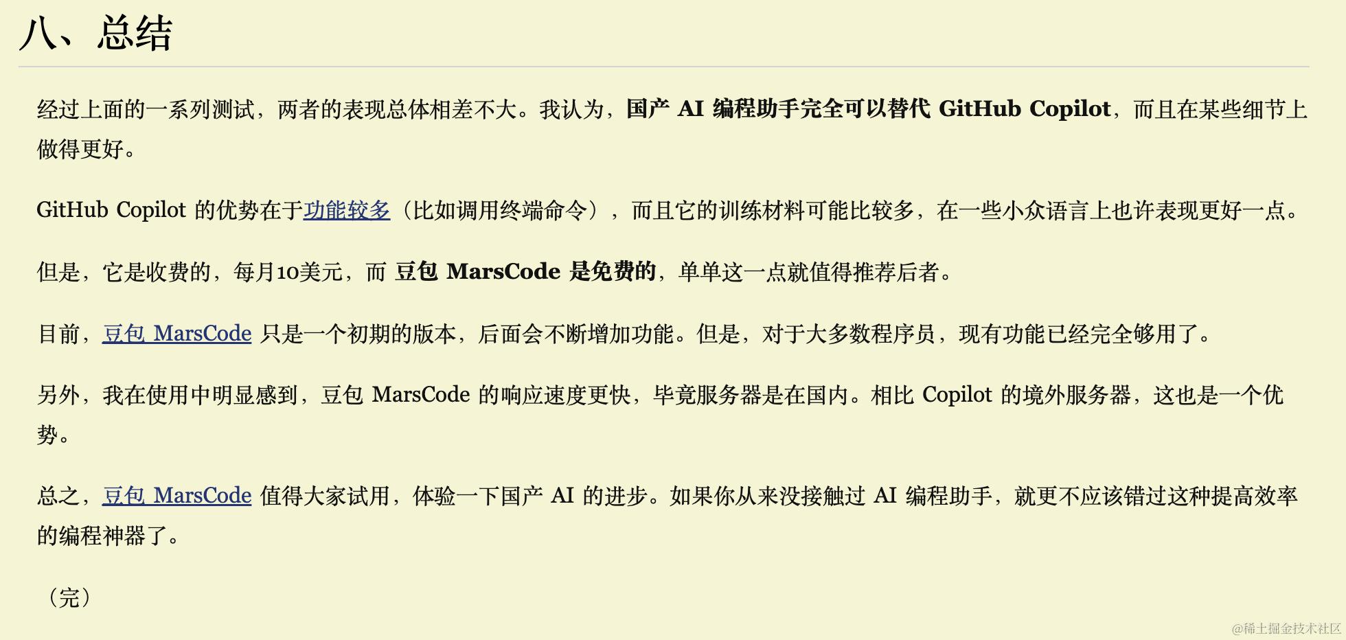 无论如何,MarsCode 是可用的,有创新的,先进的,基于 WebIDE 做 AI 是我非常欣赏的方向。我是坚定的 Web OS 信仰者,未来浏览器可以搞定所有事情,结合 AI 提效,不管我们喜不喜欢,它都一定会存在且演进,至于能不能替代程序员还需要观察,但善于用 AI 的程序员肯定是更抢手的。从 MarsCode 开始,展望一下未来软件开发场景,是一件很不错的事儿,推荐大家试一试。
