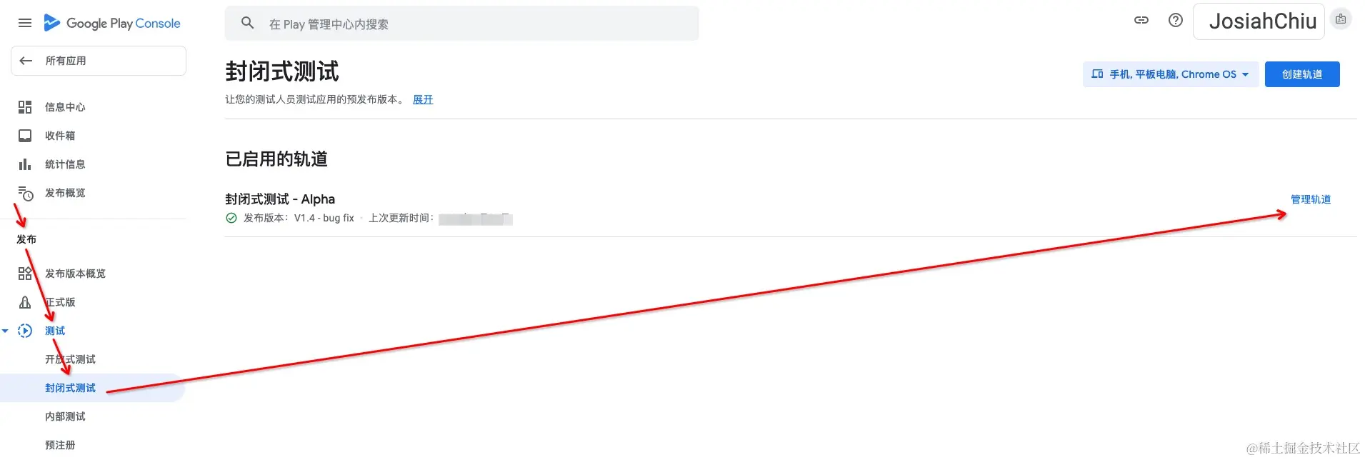 - 选择【测试】→【封闭测试】→【管理轨道】(如果没有轨道,可以创建一个)。