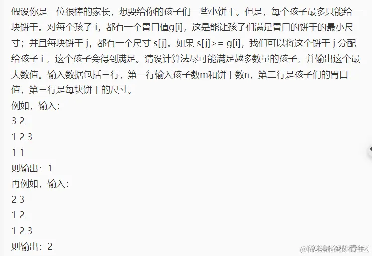 我们使用两个指针i和j,分别指向孩子们的胃口数组和饼干数组的起始位置。每次比较当前孩子的胃口值和饼干的尺寸,如果饼干尺寸能够满足孩子胃口,就将饼干分配给孩子,并将i和j指针往后移动一位。如果饼干不能满足孩子胃口,就将j指针往后移动一位,继续寻找下一个更大的饼干。