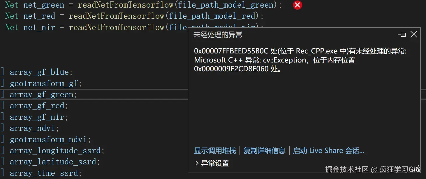 随后,加载我们待转换的、SavedModel格式的tensorflow神经网络模型。这里需要注意,我写了2句不同的代码来加载初始的模型——其中,如果用第1句代码加载模型,倒也可以不报错地运行完成上述代码,但是等到用C++ 环境的OpenCV库读取这个转换后的模型时,会出现Microsoft C++ 异常: cv::Exception字样的报错,如下图所示;而如果用第2句代码加载模型,就没有问题。之所以会这样,应该是因为我当初训练这个神经网络模型时,用的是tensorflow中keras模块的Model,所以导致加载模型时,就不能用传统的加载SavedModel格式模型的方法了(可能是这样)。