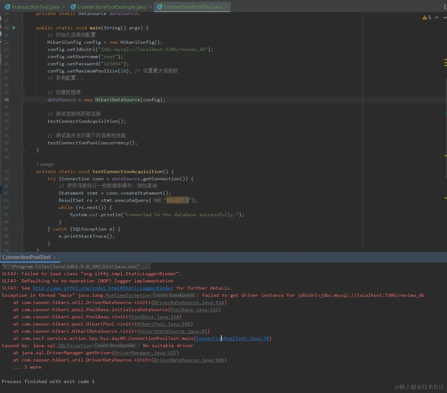 第二个错误 Exception in thread "main" java.lang.RuntimeException: Failed to get driver instance for jdbcUrl=jdbc:mysql://localhost:3306/review_db 指出在尝试获取数据库驱动实例时失败。原因是 java.sql.SQLException: No suitable driver,这表明没有找到合适的JDBC驱动程序来连接指定的数据库URL。