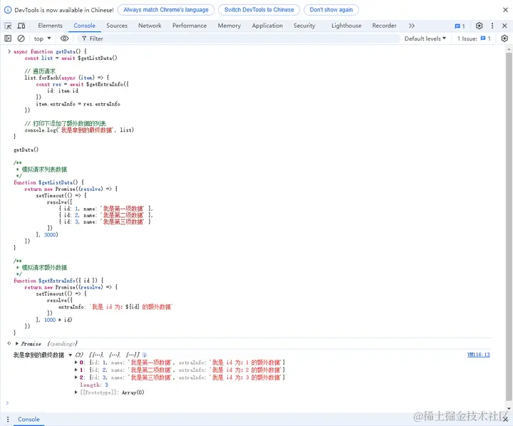 上面的代码看着好像也没啥问题,一般我们前端项目调试时,很多人可能喜欢直接在控制台用 console.log 打印,这里我们把代码复制粘贴到浏览器控制台中回车运行,直接看控制台确实也能拿到添加了 extraInfo 的列表数据,这里建议你多等几秒再去展开控制台查看折叠的数据,原因后面再说: