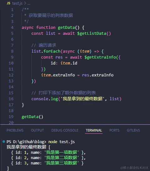 有一个列表数据,每项数据里有一个额外的字段需要去调另外一个接口才能拿到,后端有现有的这2个接口,现在临时需要前端显示出来,所以这里需要前端先去调列表数据的接口拿到列表数据,然后再遍历请求另外一个接口去拿到对应的字段数据,最后再塞到列表数据里,具体可以看下面的示例代码。