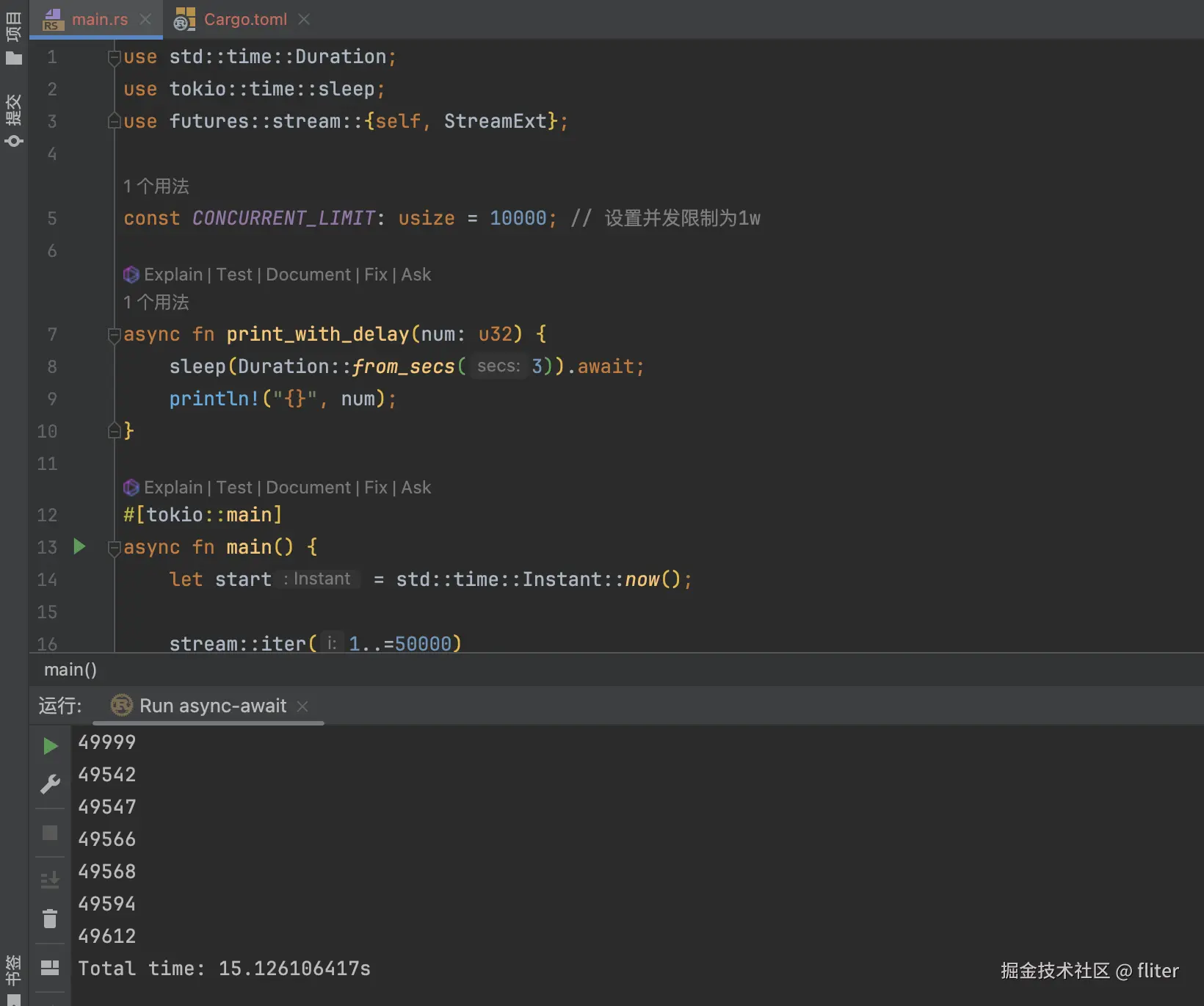 使用这两种方式之一,都可以避免一次性创建太多任务而耗尽系统资源,同时仍然能够并发地处理任务。程序会持续运行,直到所有 50000 个任务都完成。由于每个任务需要 3 秒,总运行时间大约会是 (50000 / 10000) * 3 秒,也就是大约 15 秒 左右。