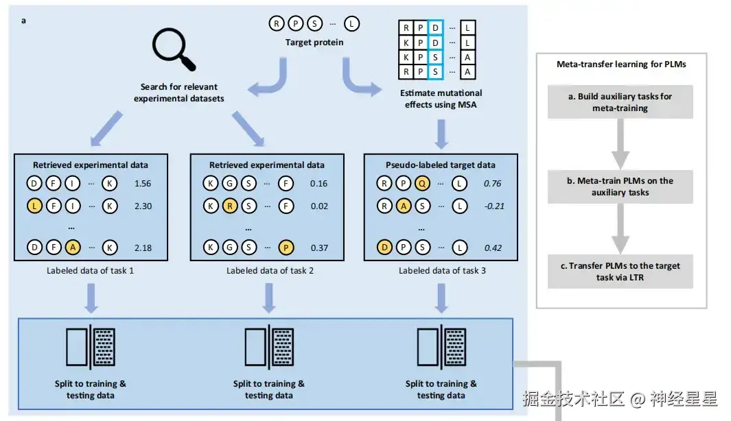 为了构建元学习所需的训练任务, 该方法首先检索现有的标记突变数据集(labeled mutant datasets),从目前最大的 DMS 数据集公共集合 ProteinGym中检索出前两个与目标蛋白最接近的蛋白质的突变数据集,并使用基于MSA的 GEMME 打伪标签方法对目标蛋白质的突变信息进行评分,以构建第三个任务的数据集。这些数据集可能有助于预测对目标蛋白的变异效应,这些任务的标记数据随机分为训练数据和测试数据。