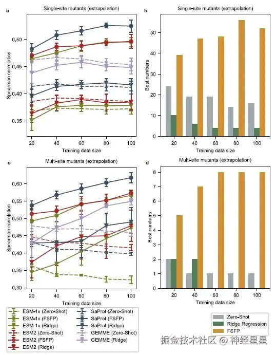 研究人员从每个原始测试集中选择所有单点突变体,其突变位点与训练示例不同,从而得到了一个与训练示例不同的单点突变体测试集。然后,研究人员选择个体突变与训练数据中的突变没有重叠的多点突变体,从而得到另一个具有挑战性的测试集。在这种设置下,研究发现基础模型的零样本性能明显地随着训练集大小的变化而变化。