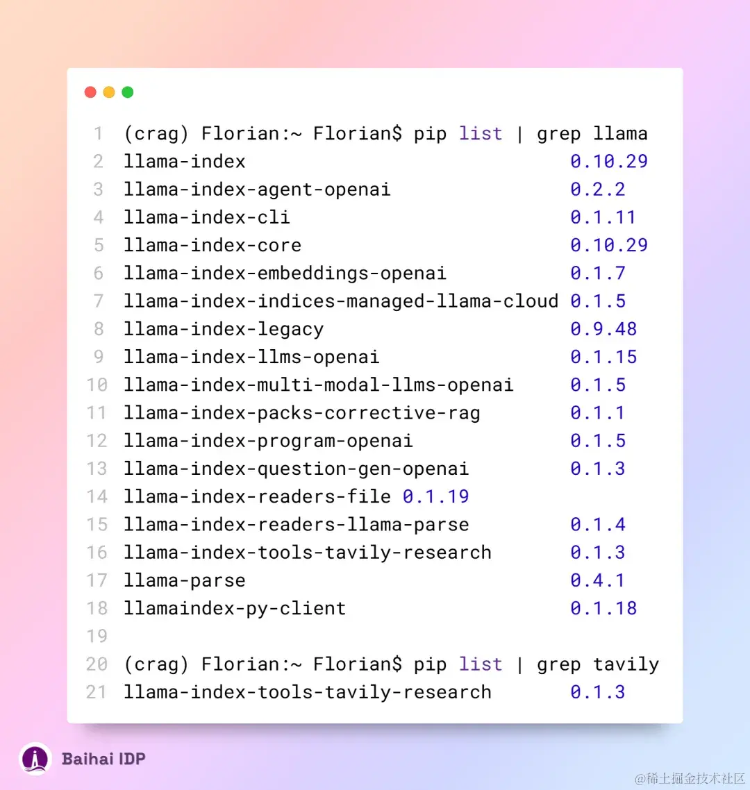 安装完成后,LlamaIndex 和 Tavily 的相应版本如下:
