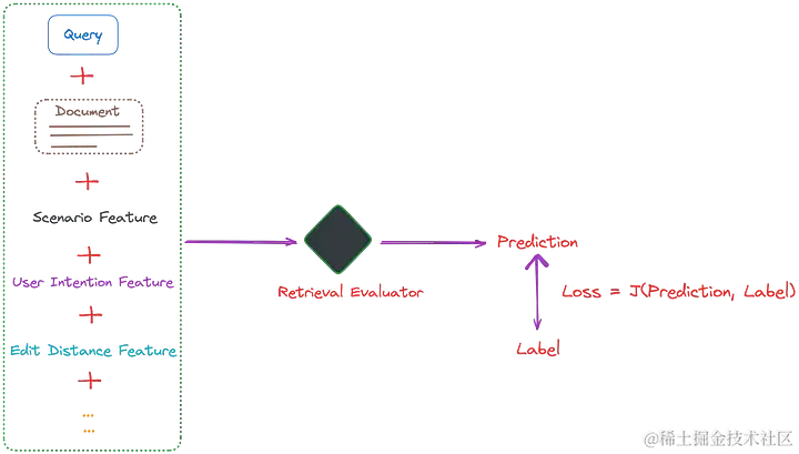 通过向检索评估器的训练数据中融入场景特征(scene features),能有效增强其评估文档相关性的能力。此外,还可以引入用户意图(user intentions)、文本差异度(edit distance)等因素作为辅助特征,如图 6 所示: