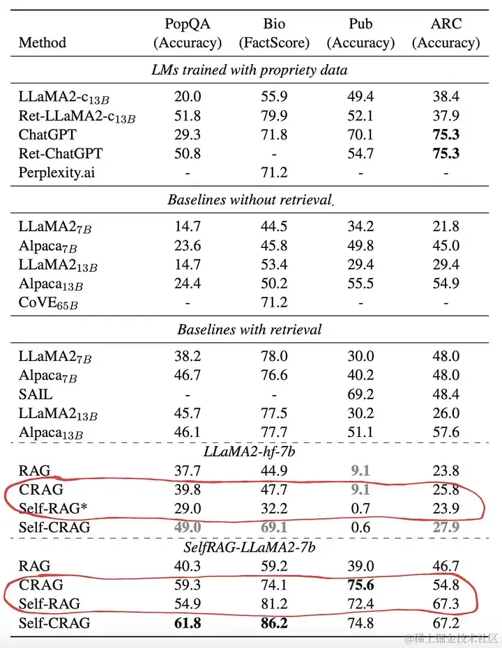 图 5:四大数据集相关测试集上的全面评估结果。这些结果依据不同的 LLM 分类展示。其中,加粗数值表示所有方法和 LLM 中的最优表现;而灰色的加粗数值,则表示特定 LLM 的最佳性能。标注星号(*)的内容是通过 CRAG 重新验证得到的结果,其余结果均直接引述自相关研究文献。Source: 《Corrective Retrieval Augmented Generation》