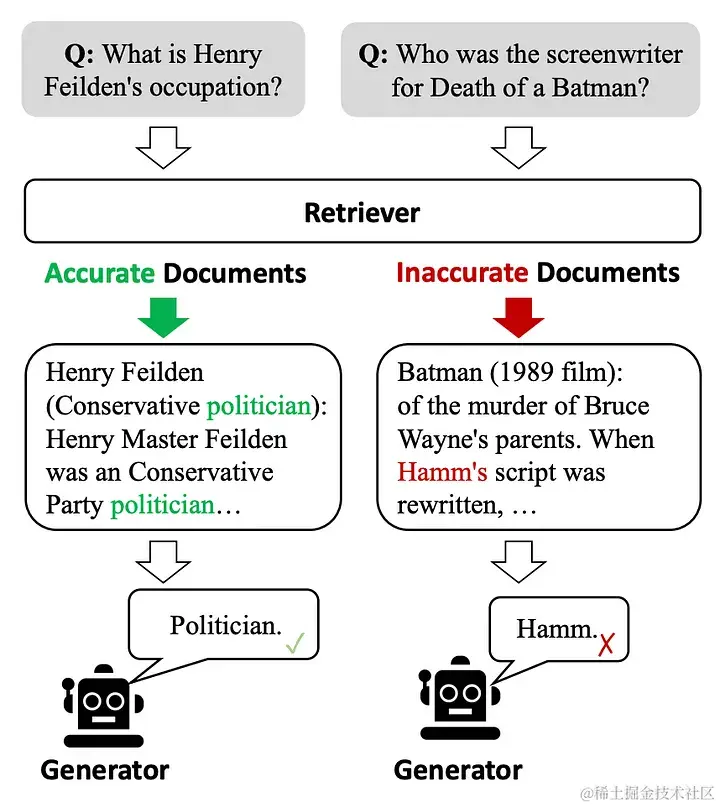 图 1:这些例子表明,低效的检索器(retriever)容易引入大量无关的信息,会阻碍生成器(generators)获取准确的知识,甚至可能将其引入歧途。资料来源:Corrective Retrieval Augmented Generation[1]