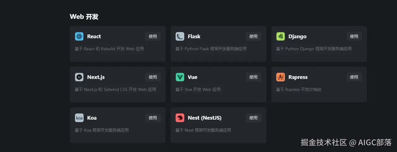 然后点击运行,就可以在右侧窗口看到代码运行的结果。相对于deepseek,豆包Marscode支持的代码语言非常广泛,涵盖各种主流web编程语言,比如React、Flask、Django、Next.js、Vue、Rspress、Koa、Nest (NestJS)等: