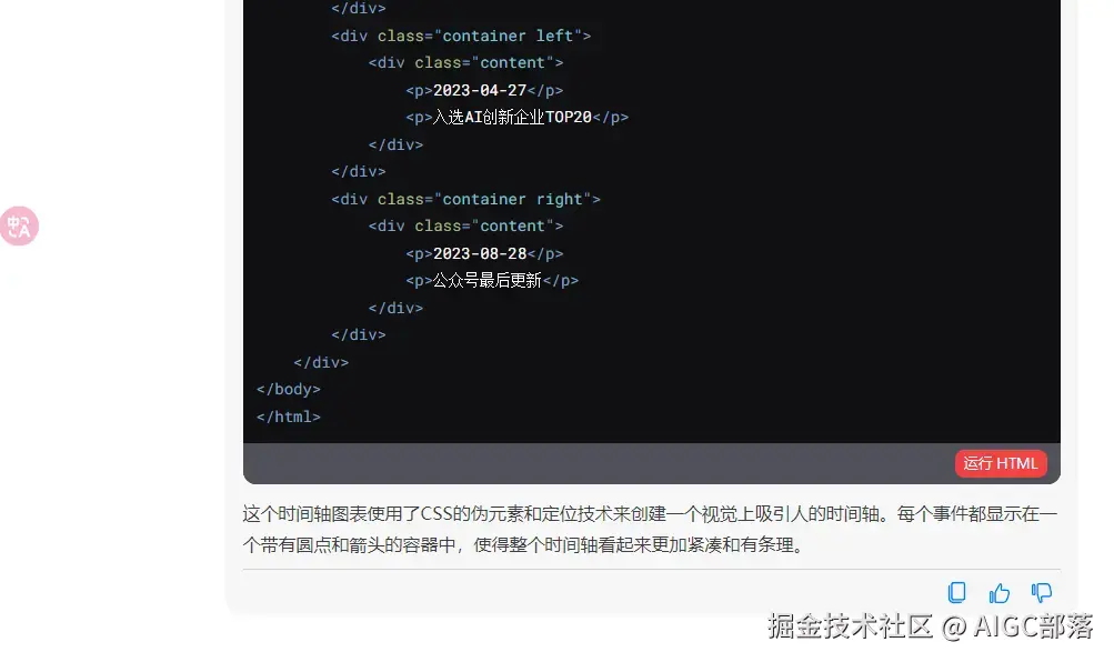 ###2022-10-01 : PromptCLUE1.0模型 2022-11-01 : PromptCLUE1.5模型 2022-12-20 : ChatYuan发布 2023-01-12 : ChatYuan大模型开源 2023-02-03 : API发布 2023-02-09 : 小程序打不开 2023-02-22 : ChatYuan升级 2023-03-24 : 支持手机 2023-03-30 : 入选AIGC50 2023-04-03 : 与外研在线合作 2023-04-18 : 升级版本发布 2023-04-21 : KnowX1.0发布 2023-04-27 : 入选AI创新企业TOP20 2023-08-28 : 公众号最后更新###根据以上内容,用html、css创建一个竖向的时间轴图表,要紧凑一些,不用滚动下拉即可在一屏中看见,字体加粗,要有设计感一些,时间要显示成年月日,标题是:元语智能大事记