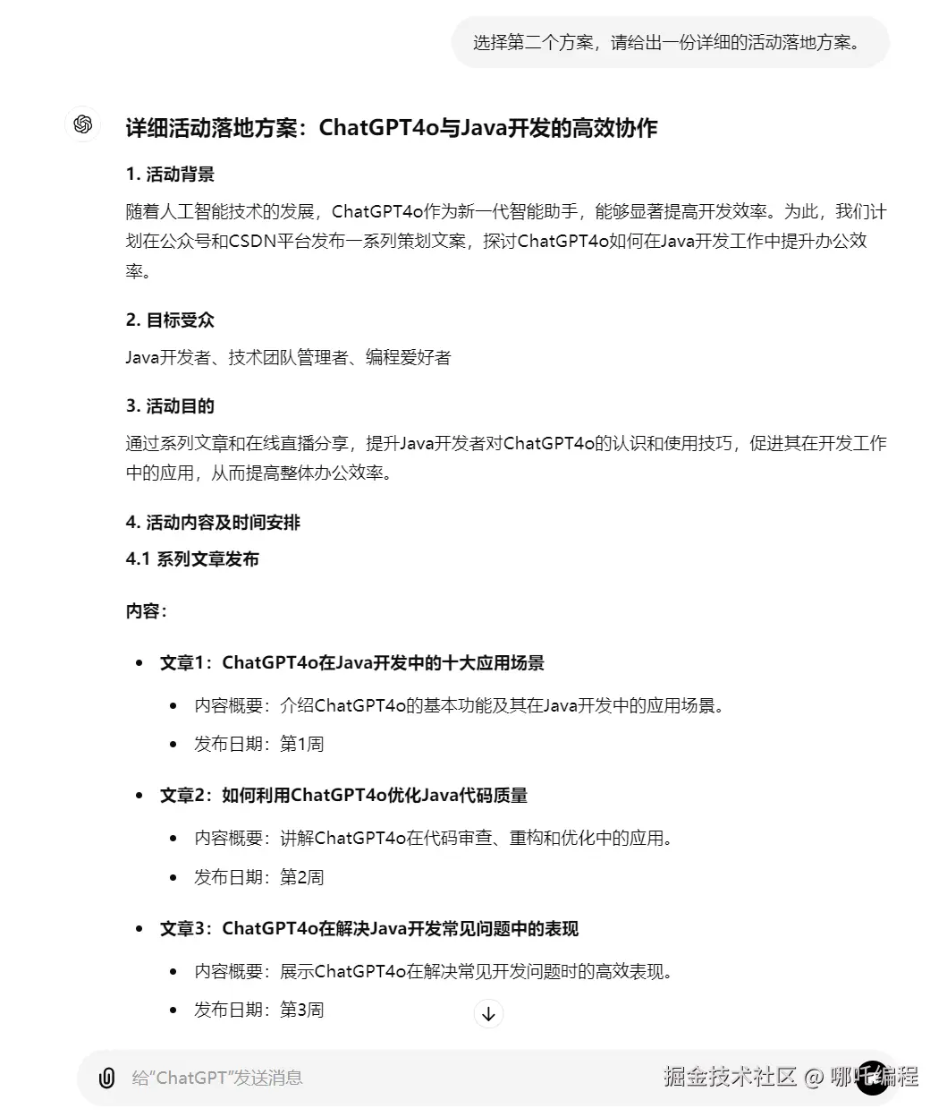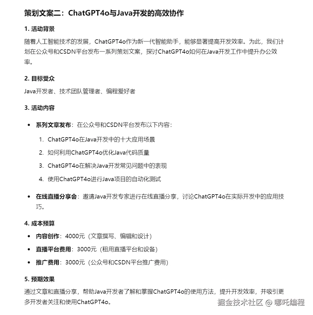 Prompt:ChatGPT4o时代已经来临,请策划三个与ChatGPT4o如何提高办公工作效率的策划文案,要求如下:1. 从事Java开发工作。2. 发布平台为公众号和CSDN。3. 活动整体成本不超过1万元