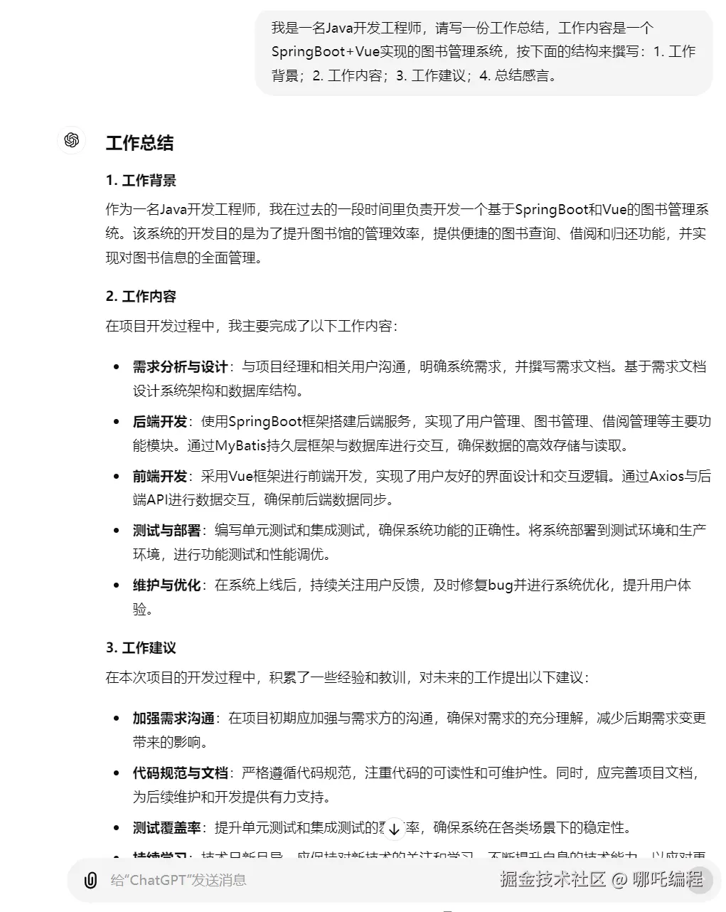 Prompt:我是一名Java开发工程师,请写一份工作总结,工作内容是一个SpringBoot+Vue实现的图书管理系统,按下面的结构来撰写:1. 工作背景;2. 工作内容;3. 工作建议;4. 总结感言。