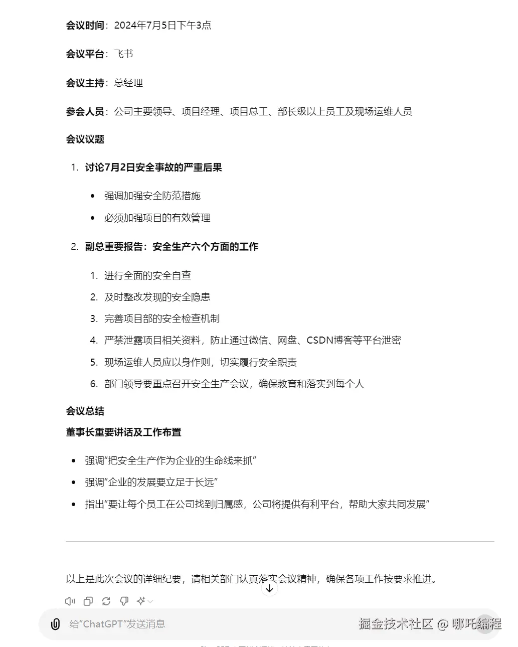 以下是整理后的会议内容:2024年7月5日下午3点,公司主要领导通过飞书召开了一次安全生产会议,参会人员包括项目经理、项目总工。会议重点讨论了7月2日发生的安全事故及其严重后果,强调了必须加强安全防范措施。部长级以上员工及现场运维人员必须参加此次会议,以加强项目的有效管理。副总在会议上做了重要报告,要求做好以下六个方面的工作: