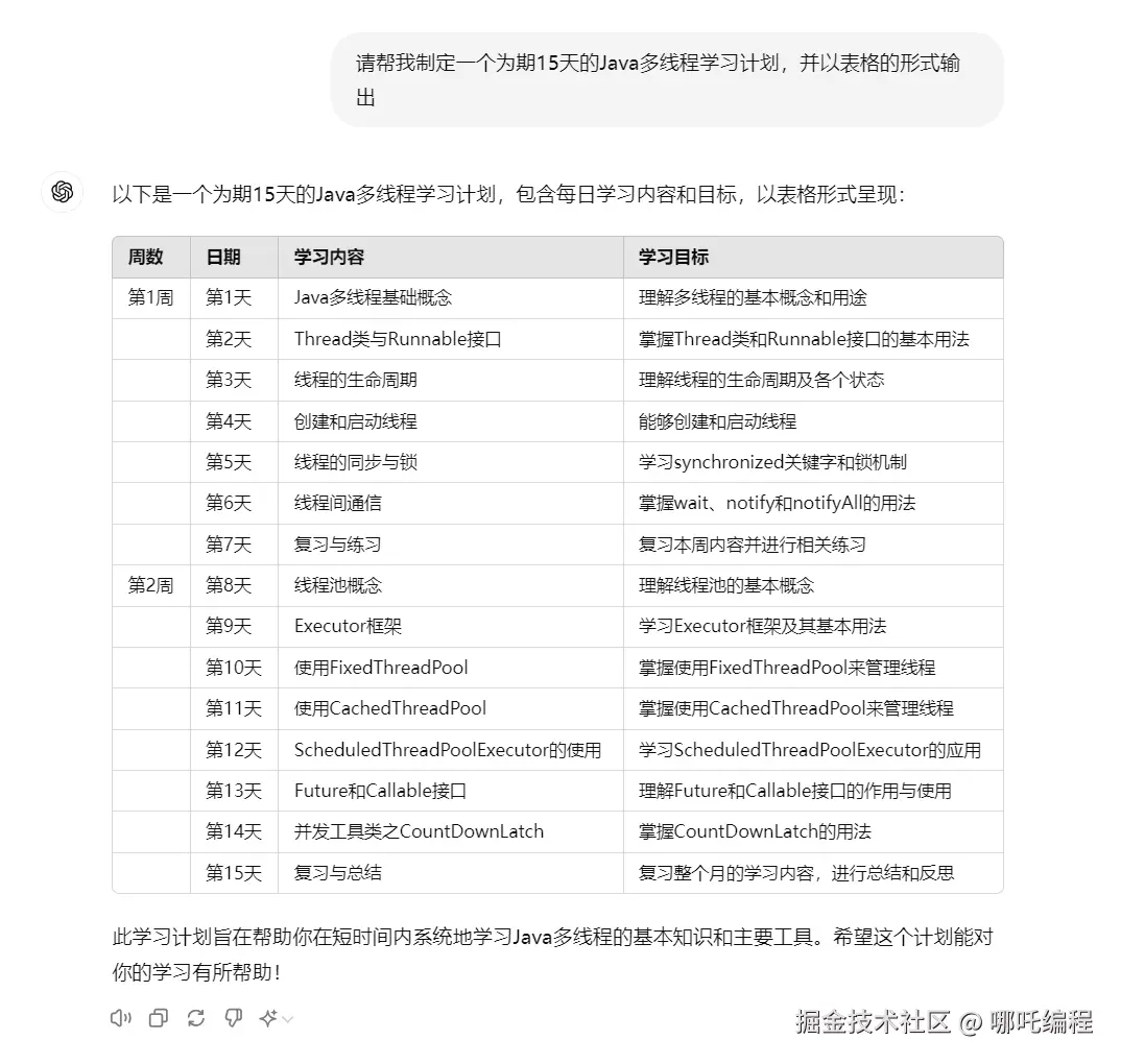 Prompt:请帮我制定一个为期15天的Java多线程学习计划,并以表格的形式输出