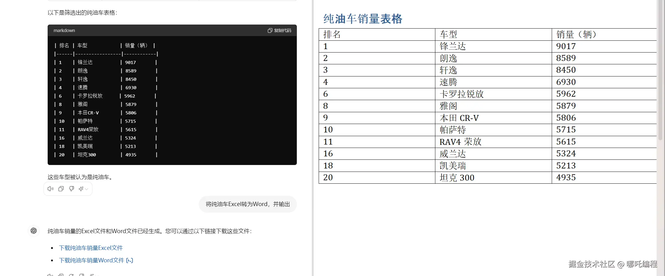 Prompt:请找出汽车销量表格中的纯油车,并将其单独输出生成表格