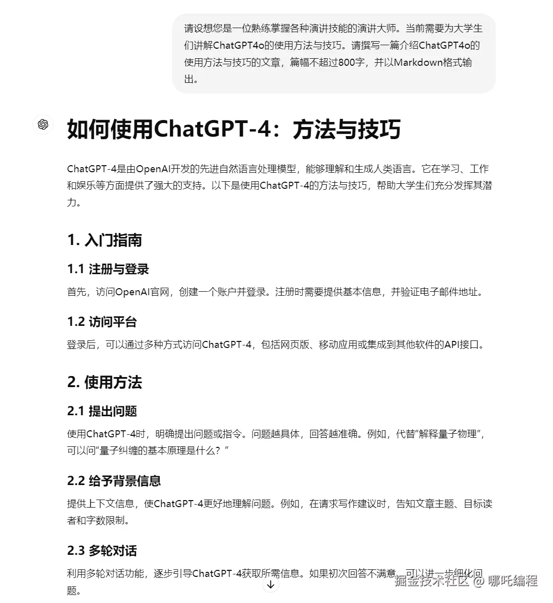 Prompt:请设想您是一位熟练掌握各种演讲技能的演讲大师。当前需要为大学生们讲解ChatGPT4o的使用方法与技巧。请撰写一篇介绍ChatGPT4o的使用方法与技巧的文章,篇幅不超过800字,并以Markdown格式输出。