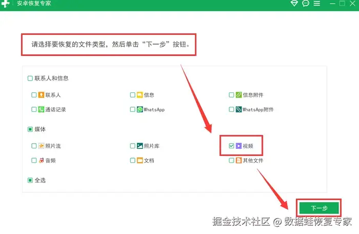 步骤2:扫描手机。 在软件界面上,选择需要恢复的文件类型—— 【视频】 。然后,按照软件提示,对手机进行扫描。