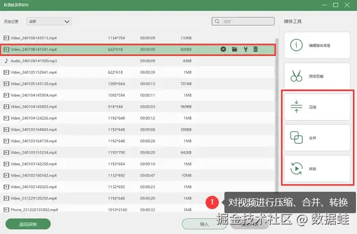 步骤4:在历史录制页面,我们还可以对视频进行高级操作,例如压缩、合并、转换等。