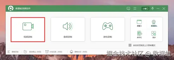 步骤1:打开提前在官网下载的数据 蛙录屏软件,可以看见多种录制模式(音频录制、录窗口、录手机等),我们选择视频录制模式。