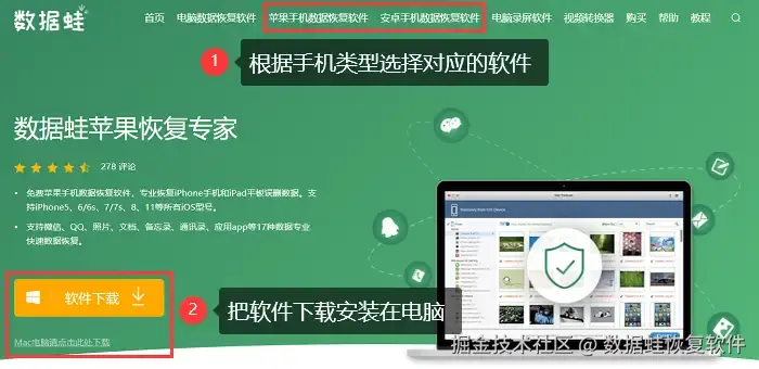 访问数据 蛙苹果恢复专家的官方网站,点击下载链接,将所选的第三方数据恢复工具下载到您的电脑上。然后根据软件提示,完成安装过程(确保软件版本为最新,以获得最佳的数据恢复效果)。