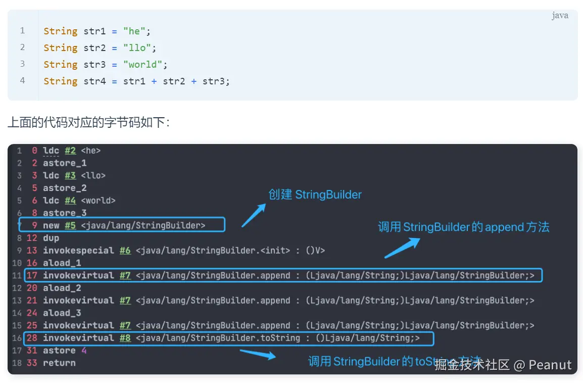 字符串对象通过“+”的字符串拼接方式,实际上是通过 StringBuilder 调用 append() 方法实现的,拼接完成之后调用 toString() 得到一个 String 对象