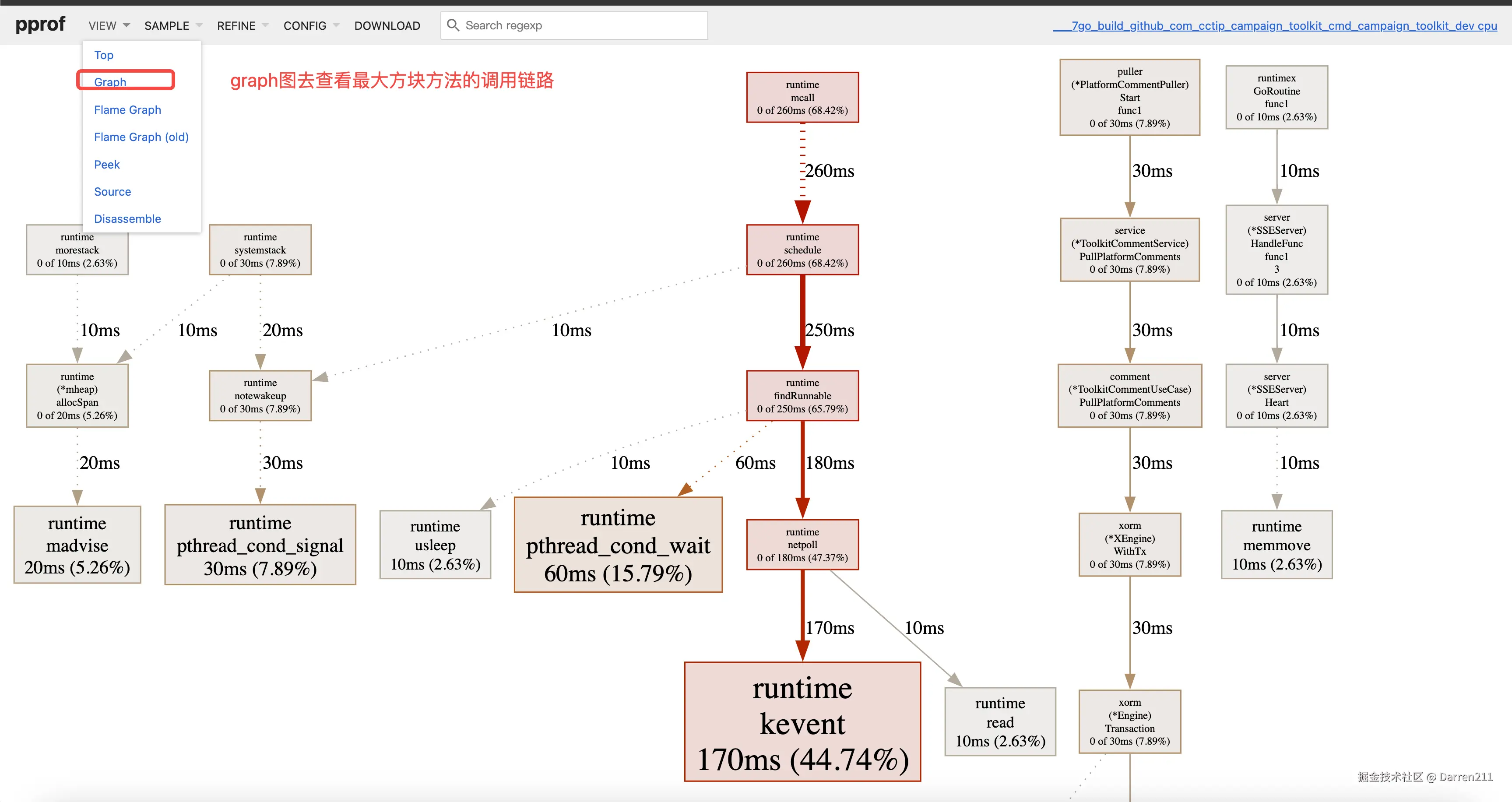 - 我们然后通过切换view去查看graph,我们去找到最大方块的调用链,就可以去定位代码了。