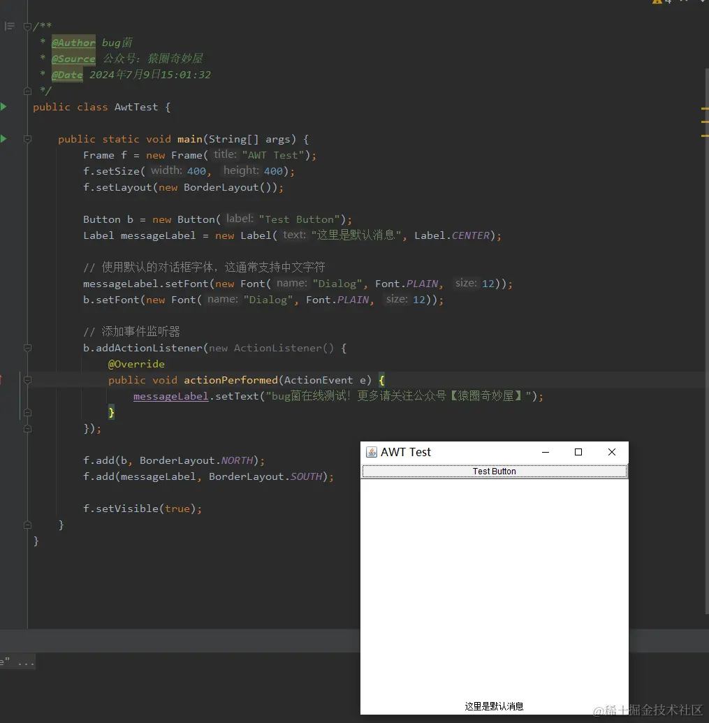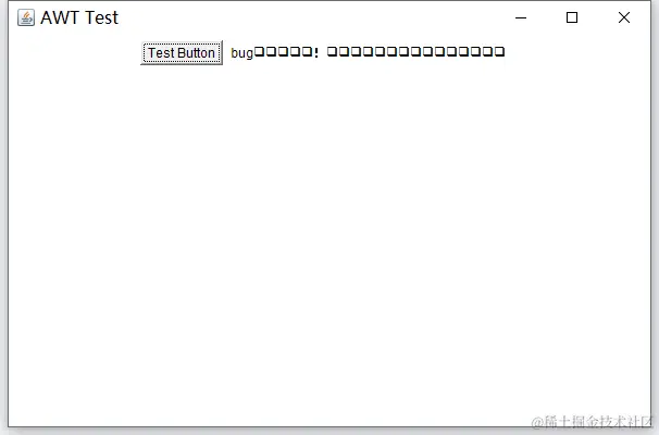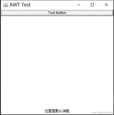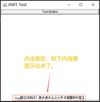 测试案例我主要是为了展示如何使用AWT创建一个简单的GUI应用程序。当用户点击按钮时,标签的文本会更新为指定的消息。可以看到界面会成功把自定义的内容给展示出来。