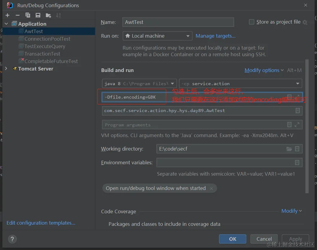 文章还特别提到了在AWT程序中可能遇到的中文乱码问题,并提供了解决方案,即通过设置虚拟机选项来指定正确的字符编码(如GBK)。