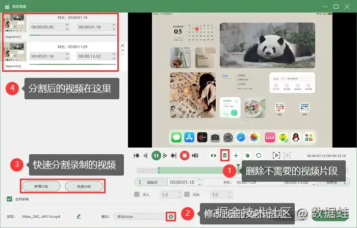 第3步:录制结束后,软件会自动进入到预览页面,我们可以对视频文件进行编辑(分段、添加特效等),然后保存到合适的位置。