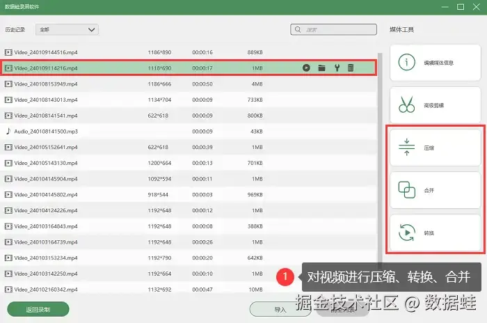 第4步:此外,还可以在历史记录页面对录制的视频进行压缩、转换、合并等处理,然后分享到社交媒体平台。