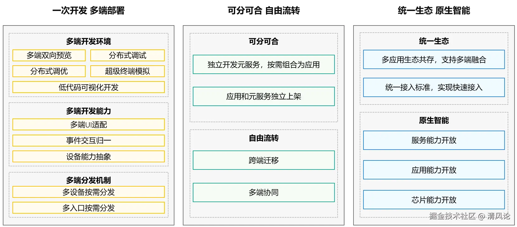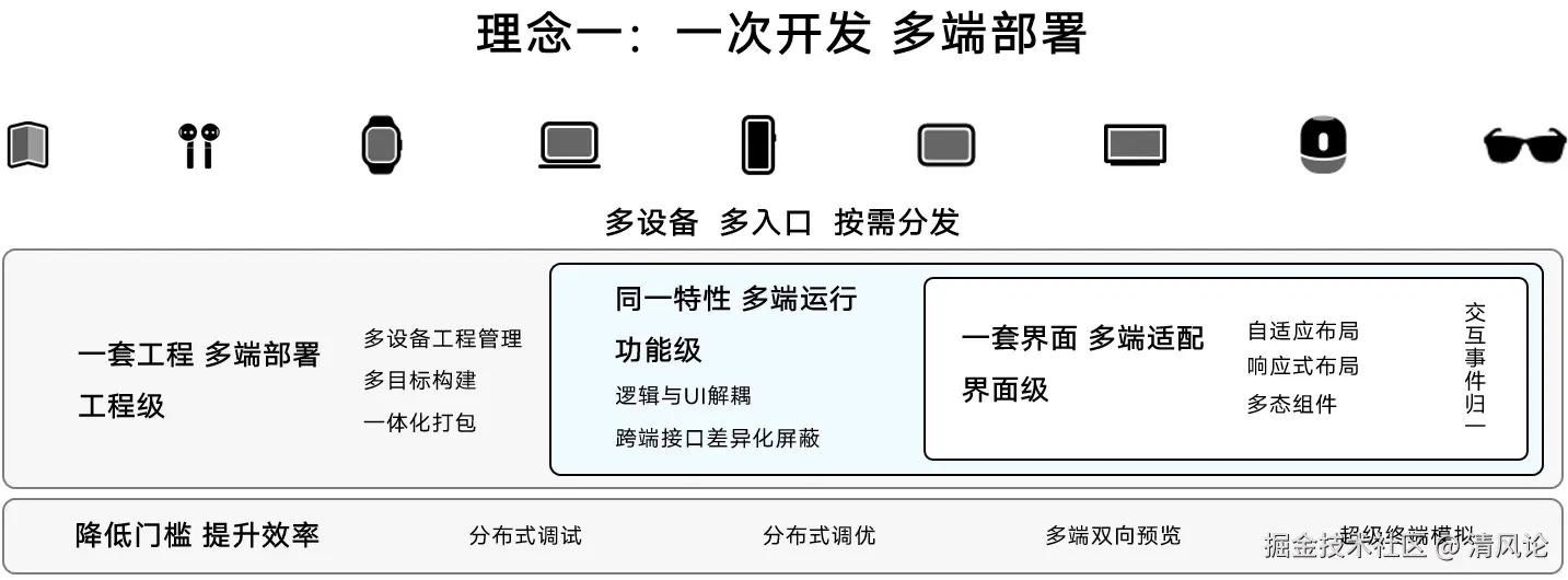 一次开发、多端部署指的是一个工程一次开发上架,多端按需部署,目的是为了支撑开发者高效的开发多种终端设备上的应用。为了实现这一目的,HarmonyOS 提供了几个核心能力,包括多端开发环境、多端开发能力以及多端分发机制。