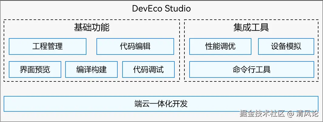 DevEco Studio 是面向 HarmonyOS 生态的集成开发环境,提供了一站式的 HarmonyOS 生态应用元服务开发能力,主要包括工程管理、代码编辑、界面预览、编译构建、代码调试、性能调优、设备模拟、命令行工具和端云一体化开发等功能。