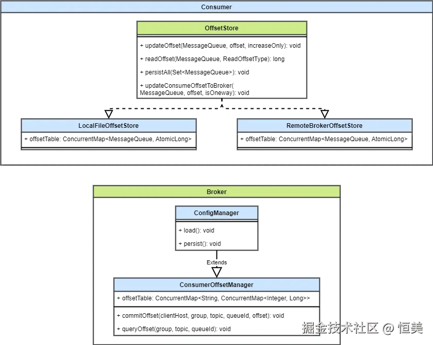 LocalFileOffsetStore:消费者本地进度存储,持久化时保存到消费者本地RemoteBrokerOffset:Broker 端存储,持久化时先保存到本地缓存,然后发送请求给 Broker,保存到 Broker 缓存。Broker 再定时持久化