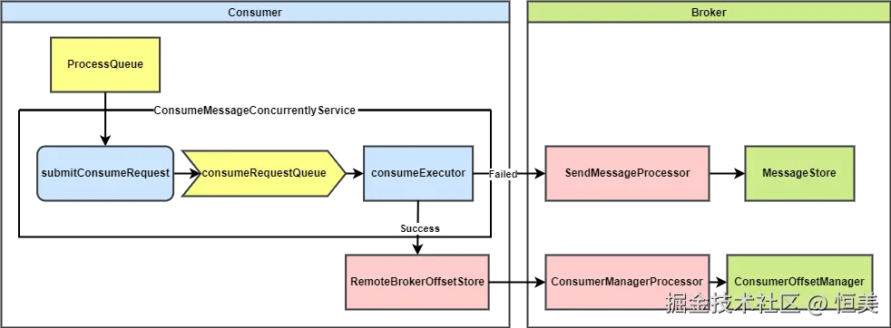 - 消费成功则将这批消息从处理队列中移除,并更新消费进度